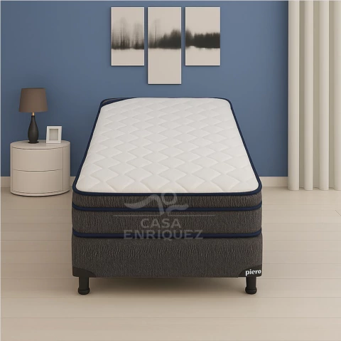 Excelente propuesta de descanso que resume la tecnología exclusiva de Piero. Posee resortes continuos, ofrece durabilidad, confort en sus mantas internas, y un tapizado en Jackard exclusivo.